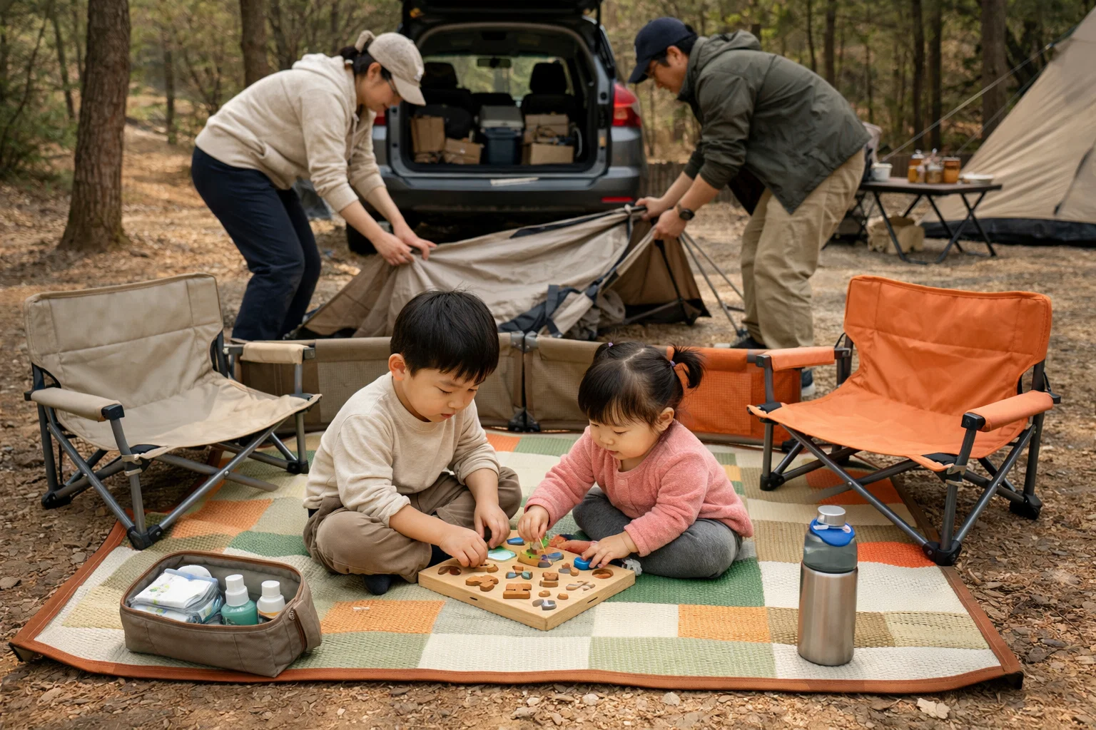 초보 가족 캠핑에서 가장 흔한 착각이 있습니다. “도착하면 빨리 텐트부터 치자.” 그런데 아이가 있으면 이 방식은 오히려 설치를 느리게 만들 가능성이 큽니다. 아이는 기다리는 걸 힘들어하고, 그 순간 부모의 시야는 설치로 가고, 아이는 위험 구역(팩/줄/차량 동선)으로 들어오게 됩니다. 저도 초반엔 도착하자마자 텐트를 펴다가 아이가 통로로 나가서 설치가 두 배로 느려진 경험이 많았습니다. 그래서 결론은 단순했습니다. 도착 직후 10분은 “설치”가 아니라 아이 안정 세팅입니다. 이 10분만 잡으면 이후 30분 설치 루틴이 훨씬 빠르고 안전해집니다.