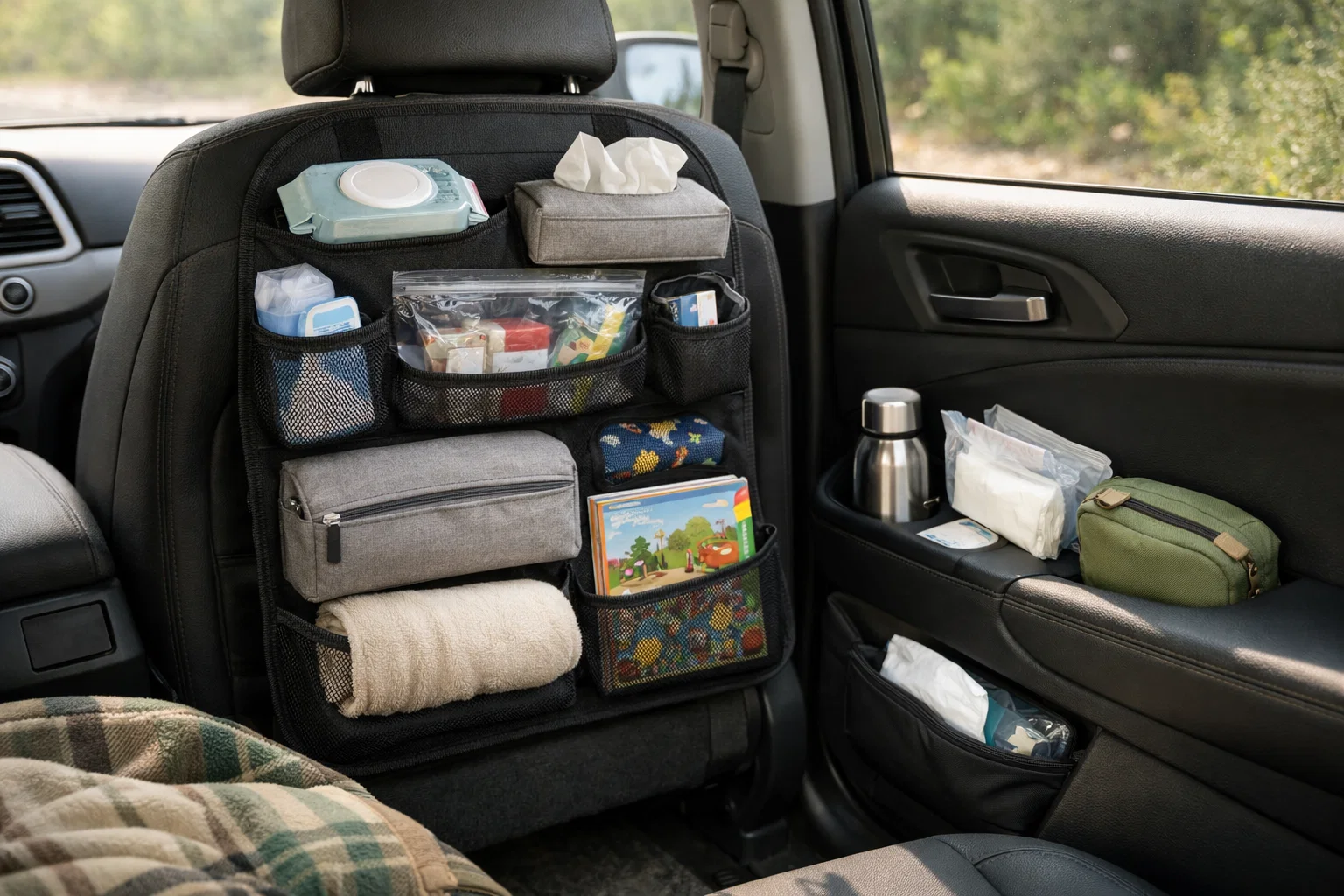 - 조수석 뒤 포켓/도어 포켓: 물티슈·휴지·지퍼백·쓰레기봉투