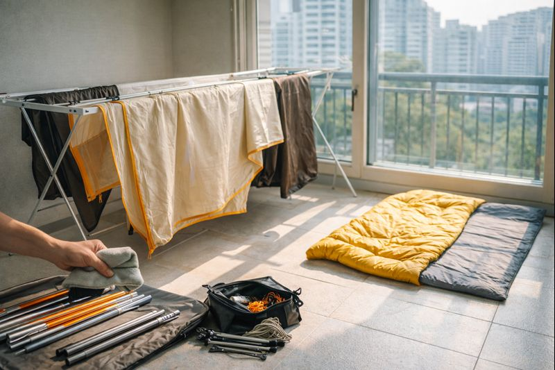 비가 온 날은 현실적으로 완전 건조가 어렵습니다. 이때는 ‘응급 루틴’이 필요합니다. - 집에 도착하면 텐트/타프/그라운드시트를 즉시 분리해 펼칠 수 있는 만큼 펼친다. - 선풍기/서큘레이터로 바람을 계속 넣어 1차 건조를 한다(최소 몇 시간). - 다음날 햇빛과 바람이 가능한 시간에 완전 건조를 마무리한다. - 건조가 끝나면 오염을 마른 상태에서 털어내고 수납한다.