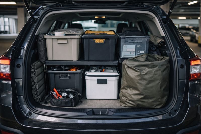 실사 사진 스타일(포토리얼), 16:9 고해상도. 배경은 “지하 주차장 또는 야외 주차장”에서 SUV 트렁크를 열어 캠핑 장비를 ‘시스템적으로’ 적재하는 장면. 트렁크 안에 크기가 다른 수납박스 3단이 안정적으로 쌓여 있고(상단 가벼운 박스, 하단 무거운 박스), 입구 가까이에 작은 파우치(팩/망치/헤드랜턴 등 즉시 필요 장비)가 눈에 띄게 놓여 있음. 옆에는 젖은 장비 분리용 대형 방수백이 따로 준비되어 있고, 빈 공간은 접이식 매트/담요로 채워 흔들림 방지 느낌. 전체는 깔끔하고 현실적, 자연광 또는 주차장 조명, 사람은 등장하지 않거나 손만 살짝 보이는 정도. 이미지 안에 텍스트/로고/번호판/간판 글씨가 절대 보이지 않게, 워터마크 없음, 과도한 연출 없음.