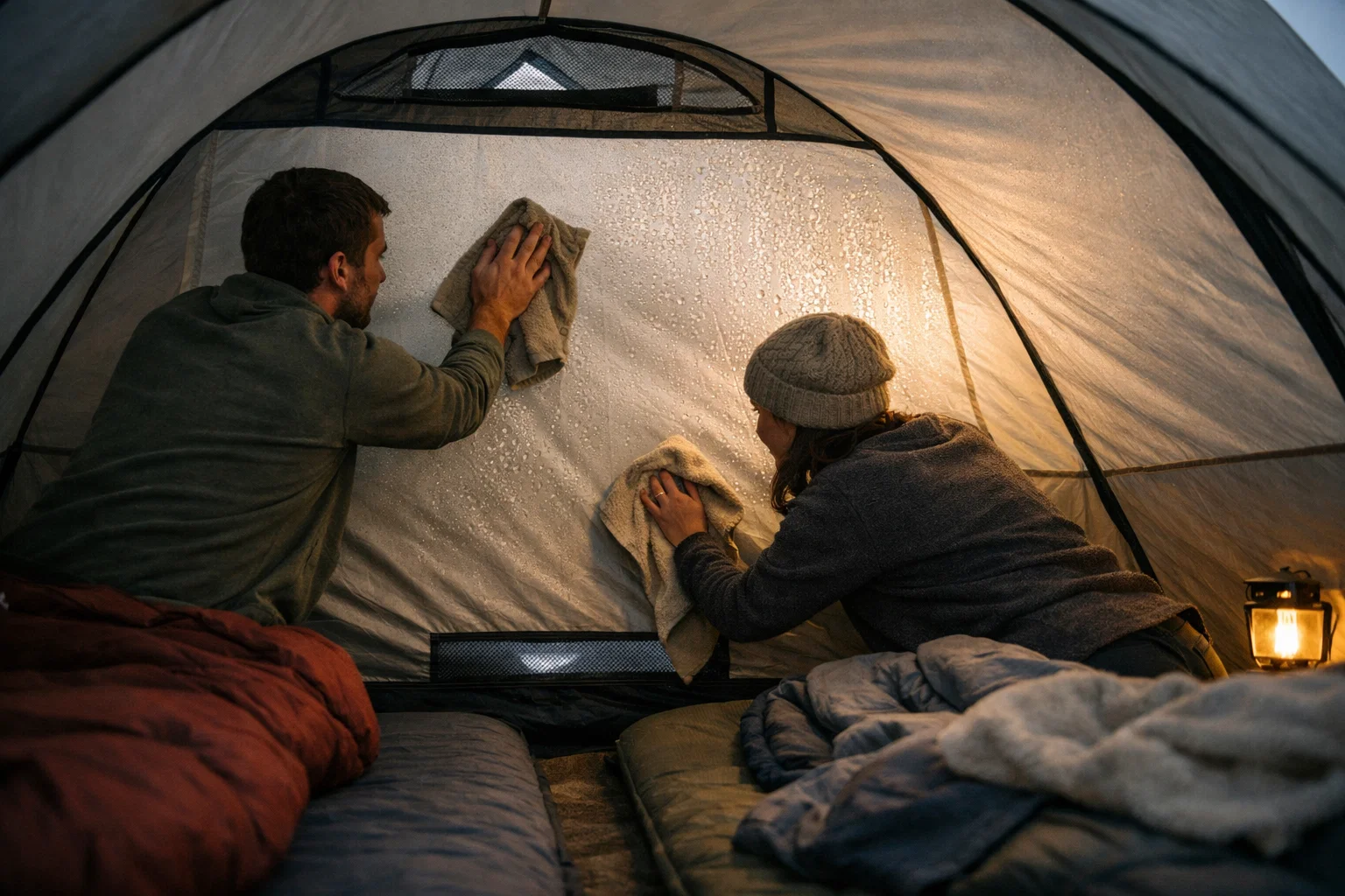 그리고 텐트 벽은 밤이 되면 바깥 공기에 의해 차가워집니다. 그러면 안쪽의 습한 공기가 벽에 닿는 순간 물방울로 바뀌고, 그게 결로예요. 저는 예전에 추울까 봐 텐트를 완전히 닫고 잤는데, 아침에 벽면이 젖고 침구도 눅눅했습니다. 그 뒤로 “닫는 게 정답이 아니다”를 알게 됐습니다.