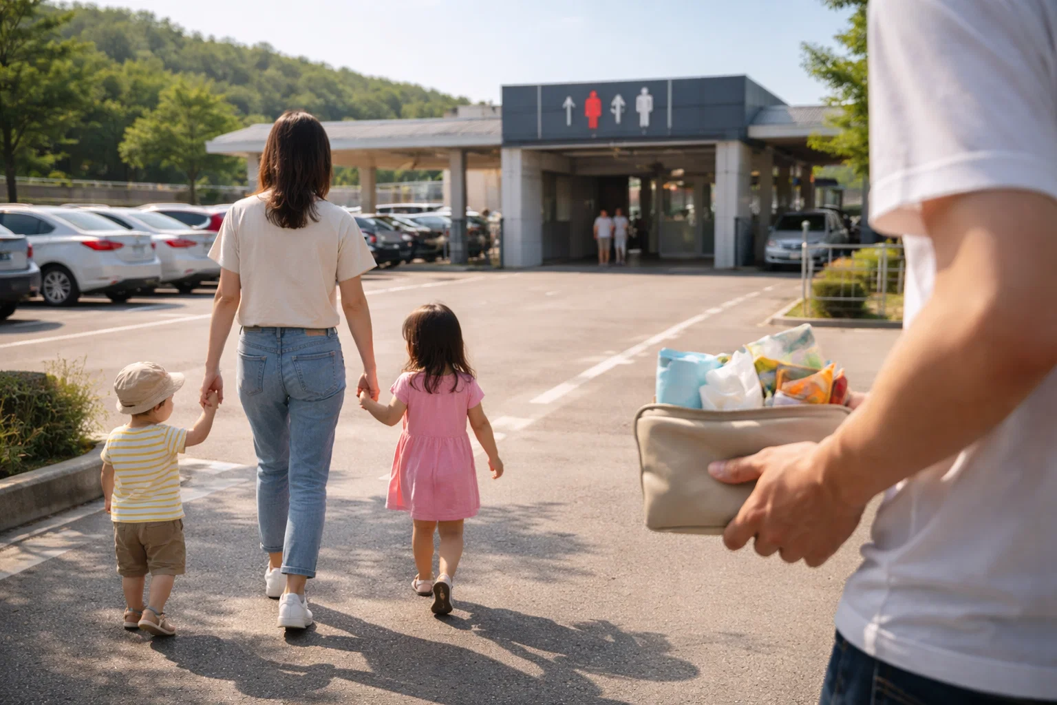 아이 동반 캠핑 이동에서 휴게소는 “쉬는 곳”이기도 하지만, 운영이 안 되면 오히려 더 피곤해지는 구간입니다. 화장실 다녀오고, 간식 먹이고, 옷이 젖었는지 확인하고, 차 안이 지저분해지고… 이걸 즉흥적으로 처리하면 시간이 늘어나고 아이는 흥분해서 뛰어다니기 쉽습니다. 저도 처음엔 “잠깐만 들렀다 가자” 했다가 30분이 훌쩍 지나버린 적이 많았습니다. 그래서 휴게소를 10분 루틴으로 고정했어요. 시간도 줄고, 아이도 안정되고, 차 안도 덜 엉망이 됩니다.